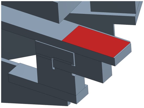 Three types of machining scenarios have been studied, so three different simulations had to be performed. Each load has been simulated by a remote force F1 = 500 N acting on the upper surface of a support. Symmetry has been enforced as described above. In order to better approximate the actual area of force application (roughly corresponding to the contact area between the vise and the support) a portion of surface has been isolated by a division line (red area in Figure 16) and the machining force applied thereof. The point of application of the force is the center of gravity of the clamped lock, as shown in Figure 17.