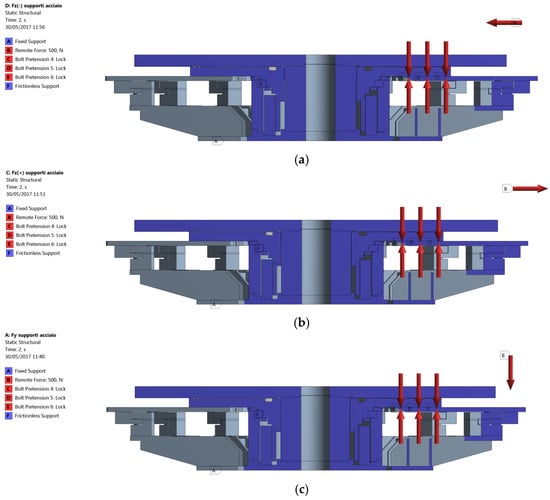 Boundary conditions with forces (a) Fz (−) (b) Fz (+) (c) Fy (−). Bolt preload forces.