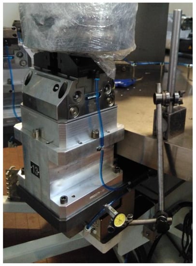 The greatest displacement on the reference point is caused by the force Fy (−) (Δy = 0.01 mm), while both Fz (−) and Fz (+) cause a displacement of 0.008 mm. The result reported in Table 5, for the Fy (−) load case only, has been compared with the experimental outcome, retrieved by means of the test setup shown in Figure 20. The FEA outcome perfectly matches the experimental result. It is noteworthy that the vertical displacement of the Transfer Machine with 15 divisions is less than 17% of that for the same machine with nine divisions, under the same loading condition of vertical downwards drilling, even though the first has a much larger (and thus more flexible) rotary table. Such an outcome has been achieved thanks to a dynamic stiffening system developed by the authors. In fact, the stiffening ribs do not spin around the y-axis together with the rotary table; they are instead fixed to the ground. The ribs and the supports at the outer diameter of the rotary table (Figure 21a: in blue shades the moving parts) are clamped together just for the machining time, by means of a hydraulic clamp whose operating principle is quite the same of a disc brake (Figure 21b). This simple device allows for keeping the rotary table comparatively light, as well as achieving enough bending stiffness when needed.
