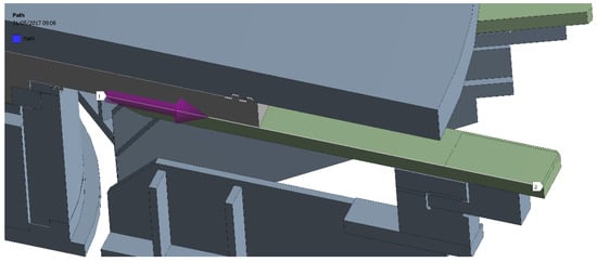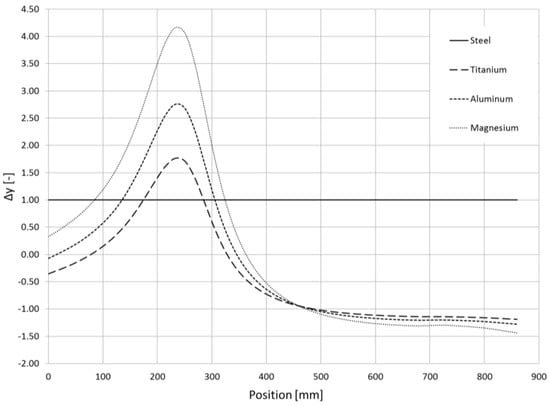 In order to assess the possibility of further weight savings on the moving parts, further FEA have been run by changing the material assigned to the supports: e.g., lightweight alloys: aluminum, titanium, and magnesium. The comparison between the different solutions has been made in the case of Fy (−).The vertical displacements have been sampled along the path illustrated in Figure 22. The results in terms of vertical displacement for different choices of the support material, normalized with respect to the steel support are shown in the plot of Figure 23, whereas Figure 24 shows the displacements obtained with different materials combinations of the support and of the rotary table, normalized with respect to the steel-steel combination.