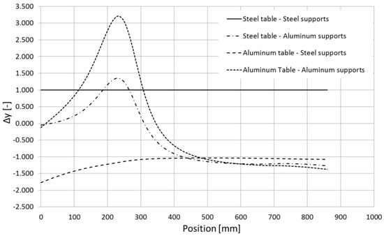 As can be appreciated by looking at Figure 23, besides Ti-alloys, which would have been impractical due to cost and manufacturing reasons, both Al-alloy and Mg-alloy supports negatively affect the bending stiffness of the assembly, especially at the outer edge where machining operations take place: a steel support is therefore the best option. On the other hand, looking at Figure 24, it can be seen that a combination of Al-alloy table and steel support would not be much more compliant than the base case with both components made of steel. The displacement at the outer end would increase by just 10−3 mm, should the lighter construction be adopted.