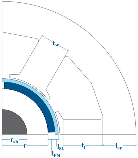 The main geometrical parameters describing stator and rotor geometry, namely the tooth width (tw) and length (tl), the rotor radius (r) and PM thickness (lPM) as described in Figure 1, are the parameters selected by the optimization algorithm. In the following, there will be cases in which the PM quantity will be not fixed but only bounded. In such cases, the PM angular span will be fixed and equal to 150 electrical degrees and the PM quantity will vary with the PM thickness between a minimum and a maximum value. In some other optimization run, the PM quantity will be fixed, then the optimization algorithm will still select the PM thickness, but its angular span will be modified so to maintain the PM quantity constant.