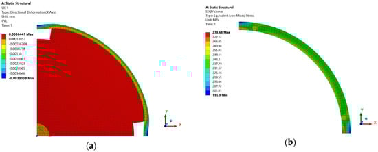 Radial displacements (a) and Von Mises stresses (b) in the sleeve material at 50,000 rpm.