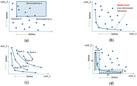 Definition of (a) dominance criterion, (b) Pareto front, (c) ranking of Pareto fronts, and (d) Manhattan distance for a two-objective minimization problem.