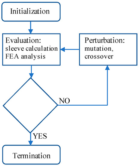 The procedure to perform the multi-objective optimization of each machine design follows the typical steps of initialization, evaluation and perturbation. The initial population is randomly selected within the search space defined in Table 2 (initialization). Then each individual is evaluated with a two-step procedure. At first, the sleeve thickness is calculated on the basis of the specific parameters of each individual (mainly rotor radius and PM quantity) according to Equation (5), then the electromagnetic performance (torque, torque ripple, internal power factor) is calculated by means of a FEA simulation using FEMM. The solutions are then ranked according to the Pareto criterion, and this ends the evaluation step. Then, the mutation and crossover operators described in [20] are applied to the current population (perturbation) so as to pass the next population to the evaluation step. This perturbation and evaluation procedure is repeated 50 times (number of generations) then the optimization is terminated and the final Pareto front is given as a result of the design procedure. Figure 4 shows a flow-chart of the proposed iterative method for the multi-physics design procedure.