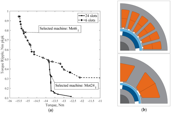 Pareto front of the T/PM run (a) and selected 6-and 24-slot machines (b).