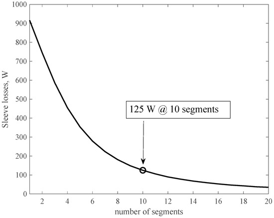 where are the sleeve losses obtained neglecting the tangential paths of the parasitic currents, is the number of pole pairs, and is the axial length of a single sleeve section and D is its diameter. Figure 8 reports the sleeve losses as a function of the number of sections in the case of motor Mot242. They are about 1 kW without segmentation and drop below 150 W using ten segments. Similar curves are obtained also for the 6-slot machines, but in this case the sleeve losses are much higher. They are about six times higher for Mot63. In order to obtain sleeve losses lower than 200 W for the 6-slot machines, the number of sleeve sections should exceed 20. In Table 3 the reported losses have been calculated considering 10 sleeve sections for all the machines. Restricting the loss analysis to copper and iron losses, CW machines have a small advantage, quantified at about 100 W, which would give a 0.2% improvement in terms of efficiency. Adding the sleeve losses, there is a clear advantage of DW machines that would be maintained even if the number of sleeve sections for the DW machine were reduced to three.