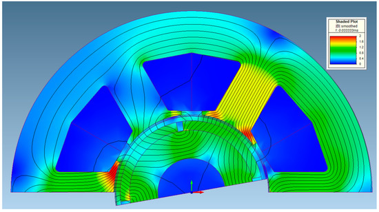 The flux density contour and distribution of the two selected motors (Mot63 and Mot242) at rated condition are shown in Figure 10 and Figure 11, respectively. The effective magnetic air gap that the magnetic circuit has to face in both cases comprehends the sleeve thickness addressing the mechanical issues, thus the air-gap flux density is lower than in an ideal case (i.e., null sleeve thickness).