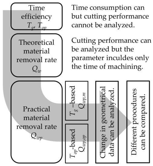 The theoretical material removal rate (Qw) defines what material volume can be removed from the surface in a time unit. It does not consider the time of machining during which the workpiece is not physically cut (e.g., manipulation). That is why it only shows the effect of change of technological data. This parameter can be calculated in the different procedures. Since it does not include all factors (e.g., sparking out, tool overrun), it cannot be considered as a sufficiently exact parameter in comparing different procedures. The calculation method of the theoretical parameter is summarized in Table 2.