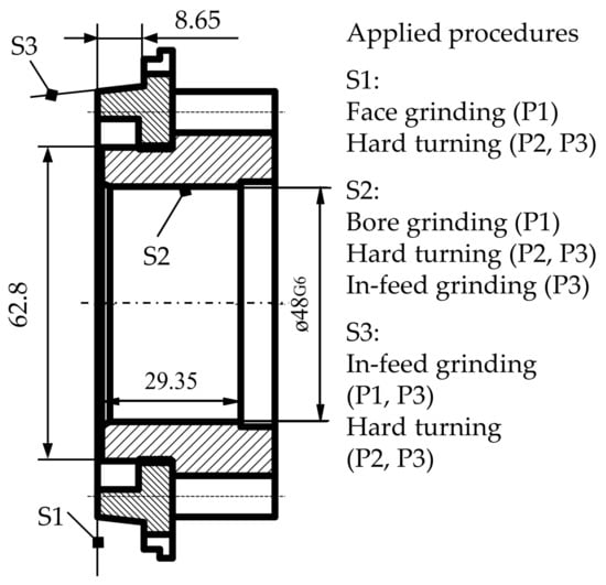 - Procedures: P1: grinding; P2: hard turning; P3: combined procedure (P3/1: hard turning, P3/2: in-feed grinding)