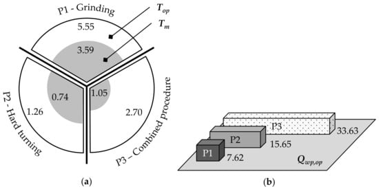 In Table 5 the machining time, the operation time and the practical values of material removal rate (Qwp,op) are summarized for a given component. The rate of machining time to operation time was analyzed and is illustrated in Figure 3a. Operation time is considered as 100 percent. While in grinding the operation time is 1.56 times higher than the machining time, this value is 1.7 in hard turning and 2.57 in the combined procedure. The arcs representing the procedures also give the absolute time values. This figure highlights that there is a relatively large difference between the machining and the operation times and that is why it is worth focusing on the role of operation time in efficiency analyses. The values of the practical material removal parameter are given in Figure 3b. The values of grinding and the combined procedure are lower than those of hard turning for the analyzed component. In the figure it can be seen that despite this great difference the Qwp,op value of the combined procedure exceeds that of grinding. It is noted that in selection of the procedures not only the machining efficiency but also the costs of the procedures have to be calculated (e.g., machine tool investment).