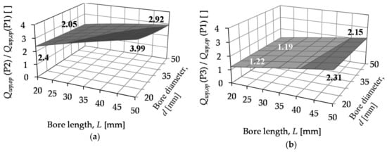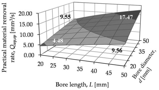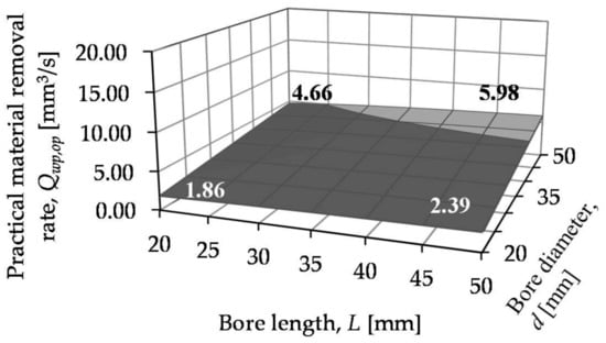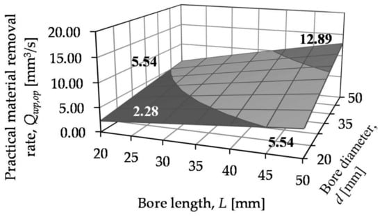 In both procedures the difference is clear, namely the value of the practical material removal rate for hard turning exceeds that of the combined procedure but the value of the combined procedure is considerably better than that of grinding. Although the practical material removal rate is the highest in hard turning, the operation circumstances of the component can require the application of the combined procedure. In Figure 5 and Figure 6 it can be seen that with the increase of both the diameter and the bore length the practical value of material removal rates increases. In hard turning when the bore length and the diameter are between 20 and 50 mm, the Qwp,op values are between 4.48 and 17.47 mm3/s. In the combined procedure these values are between 2.33 and 13.12 mm3/s. In Figure 7 the rates of Qwp,op compared to that of grinding (P1) are given for the introduced procedures (P2, P3). In hard turning the values of practical material removal rate are 2.05–3.99 times higher than those of the grinding. In the combined procedure these values are between 1.25 and 2.36. Application of the practical material removal rate analysis for geometrical data can supports the construction design of components.