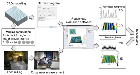 A so-called desirability approach was applied in Reference [15] for the modelling of the following output responses by Response Surface Methodology (RMS): surface roughness (Ra), cutting force (Fc), cutting power (Pc), specific cutting force (Ks) and metal removal rate (MRR), during the face milling of the austenitic stainless steel X2CrNi18-9 with coated carbide inserts (GC4040). A full factorial design (L27) is selected for the experiments and ANOVA is used in order to evaluate the influence of the cutting parameters of cutting speed (vc), feed per tooth and depth of cut (ap) on the out-put responses. Nguyen and Hsu [16] investigated the effect of the cutting parameters on the surface roughness parameter Ra with a combination of the Taguchi method and the RSM. They have used quadratic mathematical modelling to estimate and the desirability function to minimize the Ra parameter. The effects of the insert runout errors and the variation of the feed rate on the surface roughness and the dimensional accuracy were analysed in Reference [17] in a face-milling operation using a surface roughness model. Schmitz et al. [18] investigated the effect of milling cutter teeth runout on surface topography, surface location error and stability in end milling. They pointed out that the cutter runout is an important issue in machining as commercially-available cutter bodies often exhibit significant deviations in milling insert locations in axial and radial directions; therefore, the chip load on the individual cutting teeth varies periodically. A numerical calculation model is presented in Reference [19] for predicting the profile of the surface and surface roughness values (Ra) as a function of feed (f), cutting tool geometry and tool errors. The research was focused on cutting with inserts that had a relatively large nose radius (r), and the influence of such tool errors were described in-depth as radial (εr) and axial (εa) runouts.