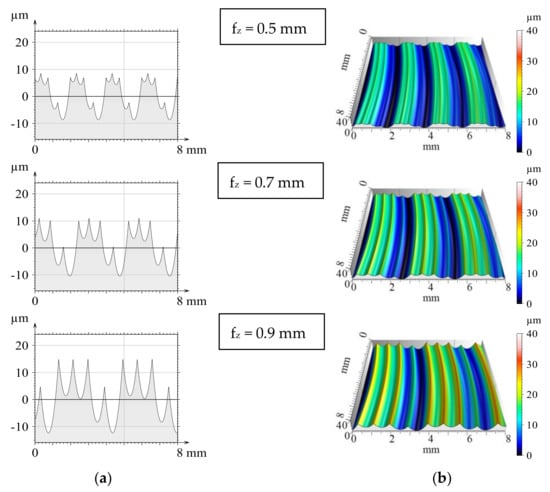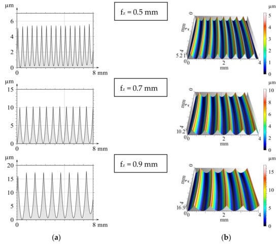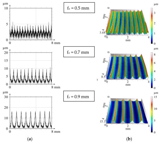 Input parameters of the modelling (material quality, geometrical and technological parameters, etc.) were matched to the intended machining experiments and the ranges to be examined. After the modelling steps were completed, both the 2D and 3D profiles and the previously calculated theoretical values were available. From the theoretical values obtained by modelling, Figure 2 shows the results of three feed values for the simulation performed with a single circular insert (iC = 12 mm). Based on the presented topographic graphs, it can be seen, that profiles and three-dimensional surfaces obtained by modelling show a regular periodicity and accurately characterize the increase in surface roughness by increasing the feed.