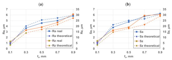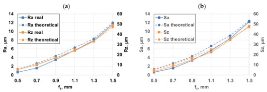 The analysis should be started by comparing the roughness values of milled surfaces machined by one and four inserts. In both cases, values of all parameters increase with increasing feeds and the change is of the same nature. It was also observed, that the Ra and Rq parameters as well as the Sa and Sq ones are varying in the same way and their values are very close to each other. So, only one of them, namely the much more widely used Ra (and Sa in 3D) will be evaluated in the following. Along with the same feed per tooth, the roughness is always lower for cutting with a single insert. After machining with four inserts, the roughness of the surface has increased considerably compared to machining with a single insert. For fz = 0.5 mm, the theoretical values are 3.81 times greater for Ra, 3.31 times for Rz, 3.79 times for Sa and Sz is 3.45 times larger when machining with four inserts. Table 5 shows that the differences in measured values are even greater.