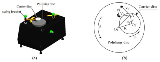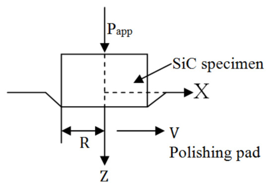 where h is the amount of material removal and is a proportional constant that is related to various environmental factors. Therefore, the amount of material removal at one specific point can be derived according to Equation (2) [15,16]. However, contact between the specimen and polishing disc changes dynamically with polishing time, which induces uncertainties in analytical investigation of the annular polishing process. Therefore, three main assumptions are made to simplify the operation: (1) The specimen and polishing disc are completely in contact without separation; (2) the applied pressure does not change over polishing time; and (3) the proportional constant does not change over polishing time.