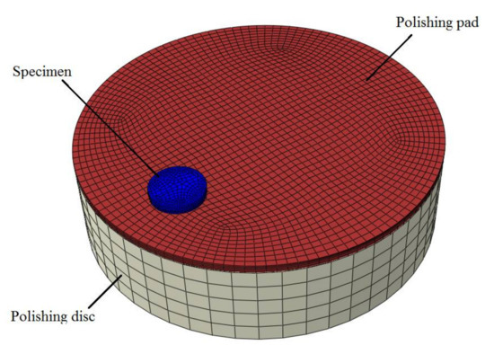It is known that grid configuration greatly affects the accuracy of prediction results in FE simulations. The three aspects of cell type, cell shape and grid density need to be considered when configuring grids. In the present work, a structured mesh was used to divide meshes by using a linear hexahedral C3D8I element with eight nodes. Grid density increased with increasing distance from the center of specimen. Furthermore, the mesh of the polishing pad was denser than that of the polishing disc, as shown in Figure 3.