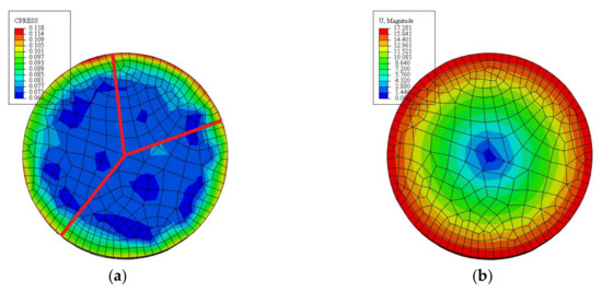 Figure 4 presents the distribution of contact pressure and deformation of the SiC specimen surface after FE simulation of annular polishing, in which the polishing disc and specimen have the same speed of 100 r/min. In Figure 4a, distributions of contact pressure in three random radial directions highlighted by the three randomly selected red dash lines are analyzed. For each direction, 30 uniformly-spaced points along the red lines are selected. Accordingly, Figure 4c plots variations of contact pressure along the three directions as a function of off-center distance, which shows that the contact pressure in the vicinity of the center of the specimen is distributed uniformly. However, when the off-center distance is higher than 10 mm, the contact pressure gradually increases with increasing off-center distance, and finally reaches the maximum value at the specimen edge. Figure 4b shows the contour of normal strain after polishing, which is related to the material removal of specimen surface. It can be seen in Figure 4b that the material removal at specimen edge is significantly higher than in the middle of the specimen.