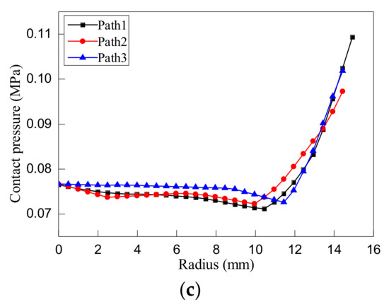 We further evaluated the influence of the typical parameters (speed, Poisson’s ratio and elastic modulus of polishing pad) on the distribution of contact pressure. Figure 5 plots variations of contact pressure along three directions as a function of off-center distance under different parameters. It was found, as shown in Figure 5, that for each parameter, the contact pressure of the specimen showed similar trends, first remaining stable and then increasing sharply when near the edge. The above results verify the pressure distribution equation obtained by the rigid body contact model presented in Equations (5), (6) and (8).