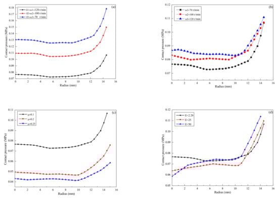 Distribution of contact pressure on the SiC specimen surface at different parameters. (a) Speed (specimen and polishing plate rotate at equal speed); (b) speed (keeping the speed of the polishing disc as 100 r/min, changing the speed of the specimen); (c) Poisson’s ratio of polishing pad; and (d) elastic modulus of polishing pad.