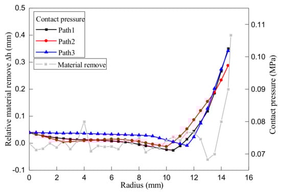 Figure 7 plots the variation of measured relative surface height with off-center distance. The relative surface height is defined as the change in measured surface height after polishing with respect to surface height before polishing. In order to show the mutual verification of the experimental results and the FE simulation results, Figure 7 further plots the variations of contact pressure shown in Figure 4. It can be seen in Figure 7 that within the off-center distance ranging from 0 to 13 mm, the relative surface height of the specimen remains relatively unchanged. Upon a further increase of off-center distance from 13 to 15 mm, which approaches to the specimen edge, however, the relative surface height of the specimen dropped sharply. This indicates that the amount of material removal also increased sharply. Figure 7 also demonstrates that the experimental results are in agreement with the FE simulation results, as material removal during polishing is proportional to contact pressure. Specifically, there is sharp increase in both pressure and material removal at specimen edge, indicating the occurrence of an over-polishing phenomenon. Therefore, it is indicated by both the simulation and experimental results that the derived analytical model of material removal presented in Equation (8) is indeed capable of describing material removal particularly related to the over-polishing of specimen edge during annular polishing of SiC.