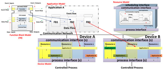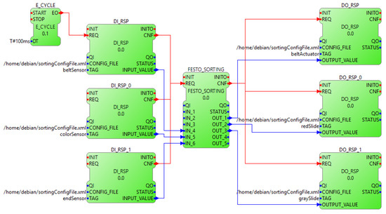 Among the initiatives that compose Industry 4.0, one of the most projected technologies is the integration of cyber-physical production systems (CPPSs) [5]. CPPSs are comprised of control devices with extensive computing and communication capabilities, both local and remote. One of the standards that allows for the design of CPPSs is IEC-61499, which is based on models, the function block (FB) being one of its fundamental models. This model encapsulates all the algorithms and data, which compensates for the absence of global variables since when using FBs, variables can be relocated and adapted to the new conditions that the process may require. Interoperability, reconfigurability, and portability are the basic characteristics for development of the IEC-61499 standard.