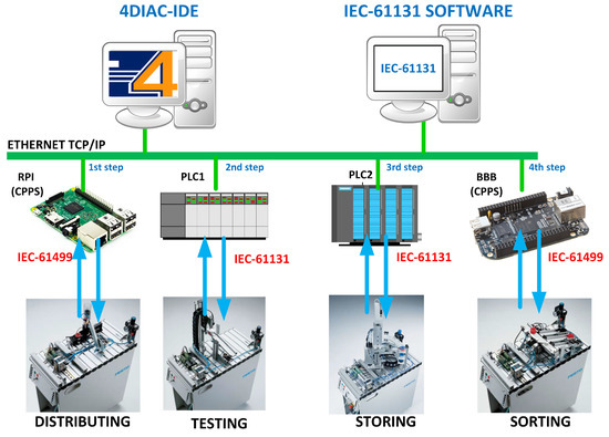 To be able to have a point of comparison between the controllers implemented in the low-cost devices under IEC 61499 and those that were implemented under the guidelines of IEC-61131, the controllers of testing and storing stations remained unchanged, while for distribution and classification stations, low-cost CPPSs such as BeagleBone Black and Raspberry Pi were used.