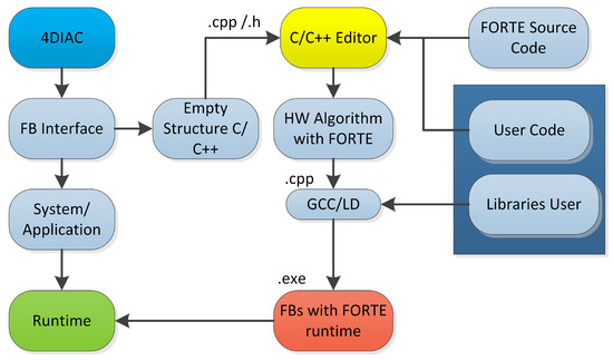 As a result of these steps, an empty C++ structure for a FB was generated according to the FORTE runtime model. The next step involved defining the IEC 61499 methods that link the algorithms to the hardware as well as including the functions that link the C/C++ code to the FORTE runtime. A general scenario of this last part of the methodology can be seen in Figure 5.