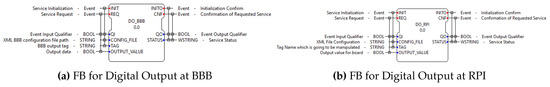 - DO_BBB and DO_RSP FBs. They are used to configure the GPIO ports required as digital outputs, by writing on them a logic value TRUE or FALSE. As with the standard FBs, these FBs receive the INIT and REQ events to start their operations, and they generate the INITO and CNF events. These FBs work with the following I/O variables (see Figure 7a,b):