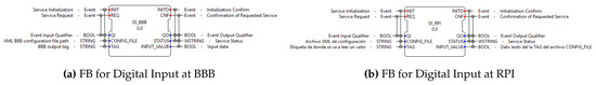 - DI_BBB and DI_RSP FBs. Their function is to configure the GPIO of the corresponding card as data entry, and when invoked, they read the input digital value in the port. As with the standard FBs, these handle the INIT and REQ events to start their operations and they generate the INITO and CNF events. These FBs work with the following I/O variables (see Figure 8a,b):