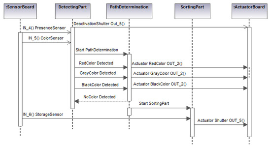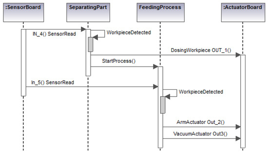 - FBs for batch control.This kind of FB uses control algorithms based on the meta-model developed in Figure 4a,b, which belong to the Distribution and Sorting stations. These FBs allow the algorithms’execution as long as the necessary conditions are met for each action to execute. As a first step, the scenario that the control algorithm must implement was designed. For this, the UML sequence diagram was used. In this diagram, the iteration of the FBs inputs with the control algorithm and the outputs that it could generate are shown. The sequence diagram contains the control algorithm’s implementation details, including the classes and diagrams designed in the previous steps and finally it indicates the responses of each of the classes involved in the control.
