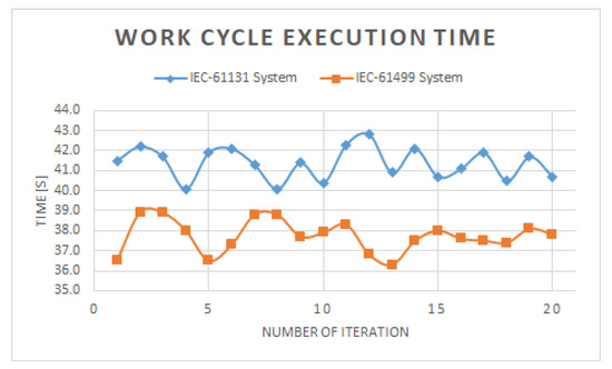 By creating generic programs and eliminating the need to manually migrate the control algorithms from one brand’s software tool to another, the new system presents enhanced configuration times by needing only to remap the application to another device in order to be able to download it in the new CPU. Finally, by comparing the results from a work cycle time length test, consisting of letting each system run for 20 iterations and recording the time invested in every loop (as shown in Figure 15), the IEC-61499 system presented shorter time periods invested in the executions, which can exponentially increment thanks to the higher processing capabilities of embedded controllers compared to IEC-61131 automats.