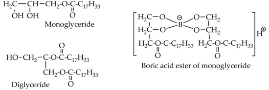 Boric acid ester of monoglyceride (see Figure 3) is a stable compound unlike boric acid ester of diglyceride. In this regard, in the product named “boric acid esters of mono- and diglycerides based on a vegetable oil” the active components are the diglyceride and the boric acid ester of monoglyceride.