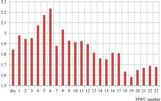 We also studied the efficiency of emulsions Nos. 18–23 and MWC with additives obtained from waste vegetable oils (MWC Nos. 14, 15) and from rapeseed oil (MWC Nos. 16, 17) (see Table 4, Figure 4 and Figure 5). An advantage of additives synthesized from waste vegetable oil is its very low cost.