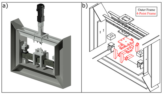 Figure 2a shows a rendered completed frame with inserted beam and actuator, whereas Figure 2b shows an exploded isometric CAD model of the outer frame in black and the inner 4-point bending frame in red. Some key dimensions are as follows: width of frame 1.5 m, height is 1.16 m, depth is 0.254 m. The outer frame is designed to provide the necessary reactionary compression and tension forces of the linear actuator that is vertically inserted between the top two I-beams. For the outer shell, conventional sized structural steel I-beams are selected as this element enables significant tensional and compressive resistance while allowing easy sourcing without additional machining of complex parts. At each corner the I-beams are cut at an angle of 45 and in-plane full penetration butt-welded together with a steel plate in between. Welding is carried out according to British standards [17]. The top section is manufactured out of two parallel smaller I-beams in order to fit the servo actuator, while the top and bottom plates are necessary to distribute tension and compression forces onto both I-beams.