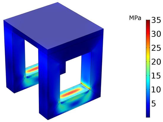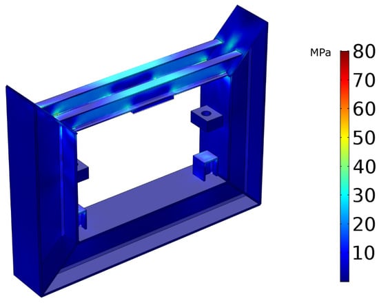 The scale shows the maximum stress level is 80 MPa; however, it is clear that the majority of stress in the components is below 50 MPa. This is well below both the yield stress = 250 MPa of structural steel and will also be within the endurance limit . According to Kucharczyk et al. [18], experiments on structural steel with yield limit of 430 MPa showed no endurance limit less than 260 MPa. A general approximation of for can be used as a guideline. This means a stress of less than 125 MPa is desired to ensure long operational lifetime. We can also see that most of the stress is applied to the top I-beams. It is important to also consider the welded sections, as the endurance limit will differ to that of steel. In the case of the outer frame—the stress is focused on the attachment point of the actuator, thus welds of I-beams are not a concern. This may require more in-depth study for the 4-point frame. To acquire a more accurate value for maximum stress, we can separately model the actuator attachment point with bolt interactions. Figure 4 shows the stress distribution for the actuator attachment during a 25 kN load in the downward direction.