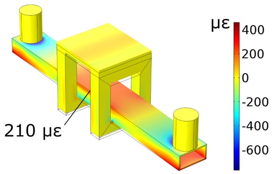 As discussed in Section 2, the frame is designed to test beams of 10 cm width and height and 1 m length of any material. To validate both the force capability of the actuator and the simulations of stress levels in frame sections, it is possible to simulate and perform a single beam experiment for comparison. If strain levels witnessed in the beam during both cases are similar—this provides confidence that the frame FEM models are also accurate without the need to install more sensors. In addition, it would be highly beneficial to carry out simulations prior to any experimentation in order to determine the maximum possible strain that can be subjected to the specimen. Any new specimen can then simply be inserted into the pre-existing model and expected strains will be known prior to experimentation.