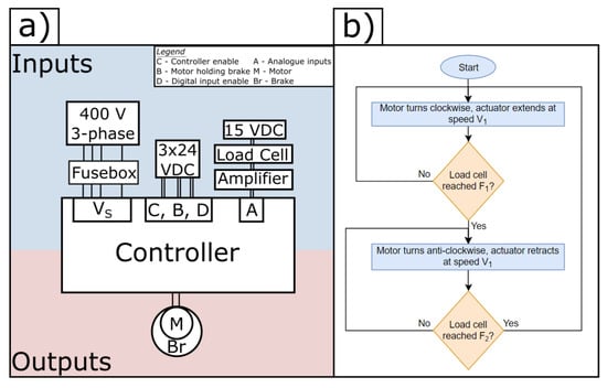 Following physical fitting, the electrical cabling is arranged according to Figure 7a. At this stage, the setup is simple, with extensive expandability in the form of analogue and digital inputs and outputs. In addition, 24 V DC supplies are required to power the controllers various features, such as the digital inputs/outputs, the brake and to enable the controller itself. A 400 V 3-phase supply is used for powering the motor. A feedback loop containing the amplified load cell voltage is used to determine the direction of the motor. A program is created for simple sinusoidal movement dependent on set force limits, as illustrated in Figure 7b. Three variables are set, compression force, , tension force, , and maximum speed, . During either retraction or extension, the direction of motor rotation is reversed once the set force is reached. The actuator acceleration is also customizable but was set at the default value in this work. This simple program will allow initial testing of a specimen to ensure that the machine meets design requirements.