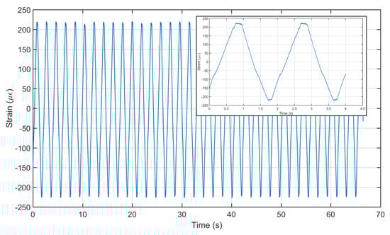 Figure 8 shows the experimental set-up of the steel beam and frame, similar to the simulation in Figure 6. The program shown in Figure 7b was run with the force limits, and , set at ±25 kN and an arbitrary speed. The sensor applied to the steel specimen were epoxied fibre Bragg gratings (FBGs), characterized as reported in [20]. Using the sensitivity of 0.89 nm/m, the strain at the centre point of the steel specimen is shown in Figure 9, with a more detailed view of the cycle inserted. The frequency of cycles is controlled by the set speed of actuator extension. Maximum linear speed of actuator is quoted as 500 mm/s. In this test, speed was set at 50 mm/s, which produced a cycle frequency of 0.5 Hz. Therefore, the maximum frequency of this load cycle is 5 Hz, although emphasis is made on the previous statement of requiring lower frequency when testing concrete. One must also consider the temperature of the controller and actuator, which may limit the cycle frequency further. An external fan is used to reduce motor temperature and was not required during the test in this work. Future work will investigate temperatures over an extended testing period. Load cell limits can be easily adjusted, allowing variable magnitude load cycles. Load and speed variables were varied during testing to ensure successful operation over the entire range. Overall, the load cycle remains stable throughout, with a tension peak of ≈220 , which, when compared to the simulation (210 ), is in close agreement (). The slight increase is most likely due to geometric differences of the specimen compared to the model—the corners are filleted for example. This was omitted in simulations to reduce computational requirements. It is clear that the cycles are not sinusoidal or triangular from the insert: this will be improved on by modifying the program to include a smoother transition. The accuracy of the machine can be ascertained by analysing the spread at the peaks of the load cycle. In other words, the deviation over time of the peak loading. Extracting the peak values of each individual cycle in this test provided an accuracy of where and are the standard deviation and mean of strain peaks, respectively. To compare this to similar machines is difficult as commercial machines would require significant customization to provide similar load tests. One commercial machine was used in previous work [21] for tensile loading of a steel specimen. Results from this produced an accuracy value of that is comparable to the machine in this work. Overall, this simulation provides confidence in the previous FEM simulations, the survivability of the frame and the overall design.