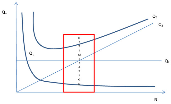 Comparing the three values to the number of produced pieces, it is possible to determine a hyperbole, a horizontal straight line, and a tilted line. Therefore, considering an economic set of production, the optimization is not in a narrow range. In this range, the curve is assimilable to a paraboloid, as shown in Figure 1.
