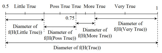 Consider the following values: true, false, more true, and more false. The problem is how to define the “fuzziness” of the linguistic value when we consider the linguistic values in terms of a spectrum around truth and/or falsity. Based on the use of hedge algebras, we have a defining “fuzziness” value based on the size of . Given a quantitative semantic function on consider that for where the “fuzziness” of is measured by the diameter of the episode . Figure 1 models the fuzziness of linguistic values.