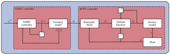 The last step in the design process is to determine the parameters of the controllers. A possible path is to tune the NMPC controller separately to the nominal plant by adjusting the values of and , so that it meets the design criterion, or using other more sophisticated techniques from the NMPC literature. If the NMPC controller is tuned, the output of the nominal system can be used as an input of the RFPT controller so that parameters and B can be determined by numerical simulations on the nominal plant. Because of its novelty, the RFPT method has no exact tuning techniques yet. However, several thumb rules exist which alleviate the tuning process; B is either 1 or , K is usually a big number with the magnitude of , and . A schematic depiction of the controller architecture can be seen in Figure 1.