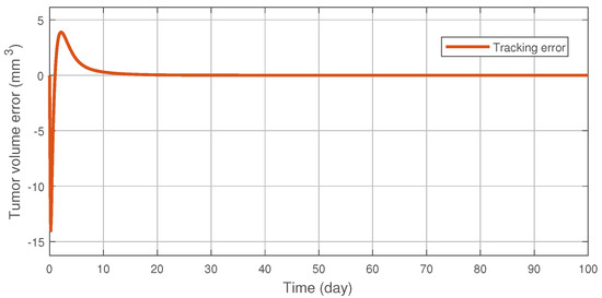 Multiple simulations were conducted in order to ensure the appropriate operation of the controller. In order to mimic real behaviour, the NMPC controller operates on the plant once every day with zero order hold. The prediction time step was (day) with a horizon of N = 24 × 14 = 336, which predicts the evolution of the system for two weeks. Control parameters produced acceptable results in terms of tumor volume reduction and total inhibitor concentration, with a maximum input signal restriction of 25 (mg/kg). For this nominal trajectory, the parameters of the RFPT controller was set as K = 5.3 × 10, A = 1/(10), B = , by empirical tuning, which produced sufficiently small tracking errors. The simulation step was (day), with time interval .