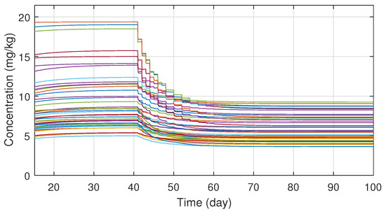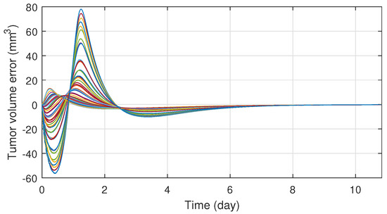In order to ensure the robustness of the controller, different system parameter configurations were simulated. The parameters were chosen with Latin Hypercube Sampling from the interval , which was then scaled to the order of magnitude for each parameter and added to their nominal values. In total fifty different parameter configuration was tested, which revealed that the system is very sensitive for parameter d, but for the other three the controller is able to manage even extreme cases as well. On Figure 6 one can see the tracking errors which are caused by the parameter uncertainties between the nominal and real models. The maximal error has increased significantly, but the error vanishes in ten days and the maxima is negligible compared to the initial value of the tumor volume. Simulations also revealed that the robustness can be increased by adjusting the value of in the kinematic part; hence was altered to . On Figure 7 the different administration protocols are shown. It is worth noting that their shape resembles the nominal case in Figure 4 and also their values do not violate the 25 (mg/kg) constraint prescription.