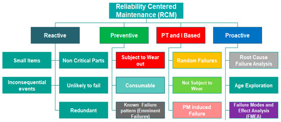 Like many other maintenance planning tools, RCM is used to preserve an item’s functionality. RCM seeks to curtail the criticality of failure as all failures can never be eradicated [18]. The first priority of RCM is safety. In cases where safety is not jeopardised, the priority becomes maintenance justified by the ability to complete the mission of availability and reliability and then the final priority is based on cost-effectiveness [19]. These cumulating into making use of RCM for the design of the system; system’s operation modes; the maintenance methods and practices; logistics, and costs data (analysis) to improve operating capability of such system(s). RCM has been found to be an integration of preventive maintenance (PM), Predictive testing and inspection (PT&I), reactive maintenance (repair) and proactive maintenance to minimize maintenance cost and downtime and consequently increase the probability of function-ability of a machine over its expected lifespan; this is succinctly represented in Figure 4 below while Figure 5 highlighted the flowchart of RCM analysis [20].