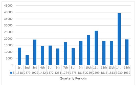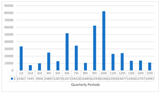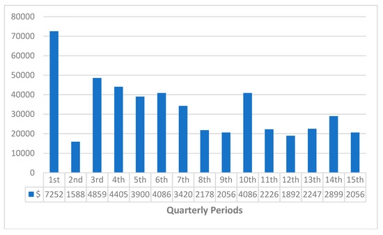 Considering the broad spectrum of all the quarters in Figure 12, there exists a minimal production downtime loss due to ware transfer failure. The exceptions are an extreme loss of over $82,000 in the 10th quarter and a relatively similar loss of $62,293.28 in the quarter before. After which a relatively decreasing trend is shown in the loss associated with downtime from the 11th quarter of the observation period until the 15th.