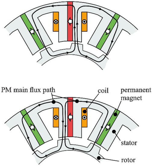 Since, with passive stabilization, three degrees of freedom are stabilized, active regulation must be provided for the radial positions (x- and y-directions) and the rotor angle [8]. This paper deals with a bearingless flux-switching slice motor. The principle of “flux-switching” is shown in Figure 2. A salient rotor is moving along stator poles, which are creating an alternating flux in the iron of the stator teeth. Each stator tooth holds a coil; subsequently, back electromotive force (EMF) is induced in the windings [9].