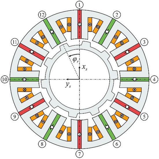 Cross-section of a bearingless flux-switching slice motor with twelve stator teeth and ten rotor poles [16].