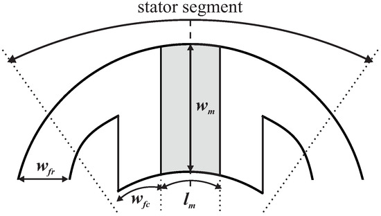 The stator teeth are composed of two iron parts and a permanent magnet in between. Every second, the PM has the opposite polarization. The circumferential length of the iron part of the stator tooth is defined by parameter . The PM’s radial length is , while its length is defined by the parameter . The thickness of the stator segment back yoke is defined by the parameter and controlled by parameter by: