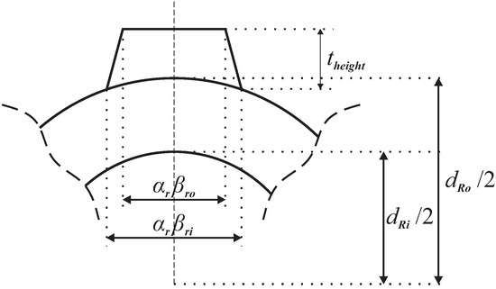Furthermore, it is important to mention the three rotor parameters that are optimized. The first one is , which influences the parameter , representing the outer circumferential length of the stator teeth defined as: